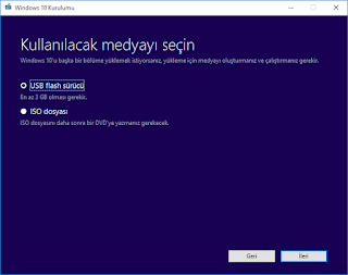Dil, sürüm ve mimari seçiminden sonra medya oluşturma ekranı geliyor. Eğer USB kurulum diski hazırlayacaksanız USB flash sürücüyü seçiyorsunuz. Windows 10 kurulum DVD'm olsun diyorsanız ISO dosyasını seçiyorsunuz.