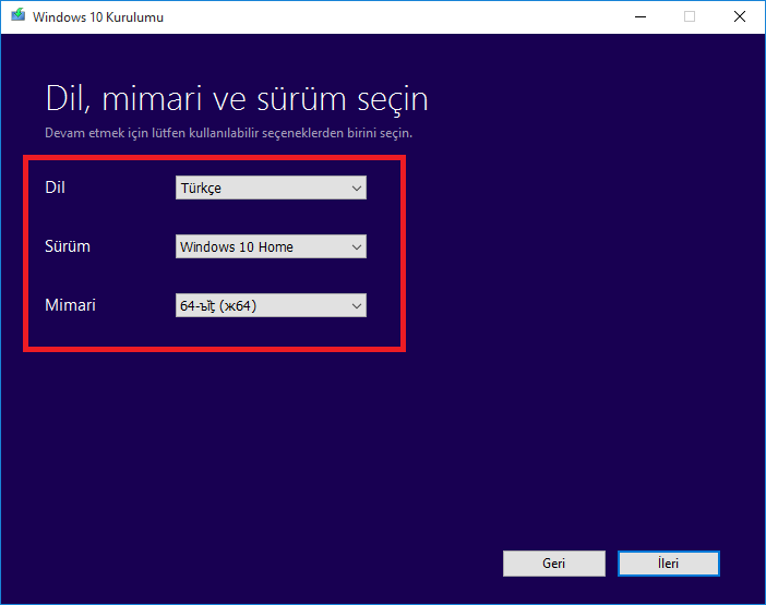Dili Türkçe, sürümü Windows 10 Home/Pro (Önceki Windows’unuz hangi sürümse onu seçmenizi öneririm. Örneğin; Windows 8.1/10 Pro kullanıcısı iseniz Windows 10 Pro’yu seçmeniz lisans sorunu yaşamamanız açısından doğru olacaktır.) olarak seçiyorsunuz. Mimari seçimi ise size kalmış.